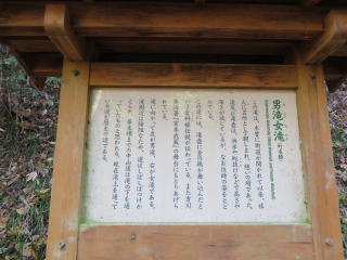 滝に向って左側が男滝、右側が女滝である。木曽に街道が開かれて以来旅人に名所として親しまれ、憩いの場であった。