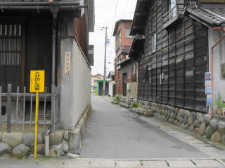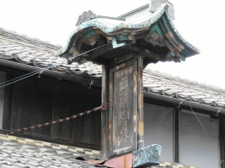 コンクリート塀に葵の紋の入った御成道標識が貼られている