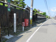 | 街道を進んで行くと北から南に水路が横切っており、水路に架けられ橋の辺りに高札場跡がある。 高札場跡の先の交差点には大エノキが見えている。 |