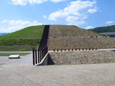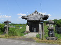 | 西濃鉄道貨物線跡を過ぎて、右手に河合石灰工業昼飯工場を見て進んで行くと、左手に昼飯大塚古墳がある。昼飯大塚古墳は今から約1600年前(4世紀末)に築かれた岐阜県最大の前方後円墳である。この墳丘の長さは150mほどあり、後円部と前方部の構造が三段築成となっている。古墳の前にある昼飯公園の一角に小御堂があり、三面八臂の馬頭観音が安置されている。 | 昼飯大塚古墳の先右手に浄土宗の如来寺がある。昔、善光寺如来という仏像が大坂の海から拾い上げられ、長野の善光寺に納められることになり、この仏像を運ぶ一行がこの地で昼飯をとったことから昼飯という地名となり、建久6年(1195)僧の定尊が村東の花岡山に三尊仏を安置して如来寺とした。後に織田信長の兵火に遭い、この地に遷座したという。折しも山門は改修中であったが、手前に地蔵堂があり、境内には観音堂あある。 | 如来寺の先で東海道本線のガードをくぐると、その先の左手に 「史跡の里青墓町 古墳粉糟山」 の標柱が建っている。標柱の向かい側に当たる集落の裏手に小高い丘上になった粉糠山古墳がある。現在古墳は青墓町の共同墓地となっている。粉糠山の地名は青墓の宿場が栄えた頃、遊女たちが朝夕の化粧に使った粉糠を捨てたのが積もり重なって小山となったので 「粉糠山」 と呼ばれるようになったという伝説がある。 | 街道を進んで行くと右手に浄土真宗本願寺派の國府山延長寺がある。山門は廃藩となった青野城(陣屋)の表門を移築したと伝えられている。天和2年(1682)稲葉正次の子・正休は1万2千石の大名となり青野城を築城したが、2年後の貞亨元年(1684)8月28日江戸城本丸内で従兄弟でもある大老堀田正俊を刺殺し、自らも斬殺され青野藩は廃藩となっている。 |