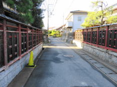 | 地蔵堂の先右手に東門院(正式名称 「比叡山東門院守山寺」) がある。東門院は、延暦年間(782-805)比叡三千坊といわれる比叡山の僧坊の一つとして最澄が開いた寺院で、桓武天皇から 「比叡山を守る東門」 として東門院の名を賜り、寺領5村350石を賜ったと伝えられている。境内には弘法堂・不動堂・鎌倉時代造立の五重塔などがある。 | 東門院の脇に明治天皇聖蹟碑が建っている。東門院は明治天皇ご巡幸の際の御小休所になっている。 | 東門院の隣に門前茶屋 「かたたや」 がある。江戸時代後期の天保年間(1830-43)の頃、東門院の門前に 「堅田屋」 という茶屋があった。堅田屋は一部旅籠の機能もあり、「京発ち守山泊り」 と言われた守山宿にあって多くの旅人が利用したという。その堅田屋と同じ場所、同じ建物で門前茶屋 「かたたや」 が営業をしている。 | かたたやの先の守山銀座西交差点を越えると境川に架かる土橋がある。旧栗太郡と旧野洲郡の境界でもあり、川が木材運搬の運河だった江戸時代の古文書によると当時は長さ20間(36m)幅2間(3.6m)あり、公儀(幕府)の負担で維持されていたという。境川を超えると守山本宿から今宿加宿に入って行く。 |