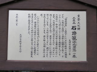 いずれにしても作成年代を示す銘文はないが、様式上、鎌倉時代の特色を持ったよい石燈籠で、貴重なものとして昭和37年6月に国の重要文化財に指定されました。