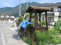 | 南条集会所の隣の南条小学校校庭の向かいに嘉永2年(1849)の筆塚碑が建っている。 | みやした文具店の向かいの家の庭先に井戸がある。 かつては釣瓶井戸であったようで屋根に滑車が付いているが、今は井戸枠に手押しのポンプが付けられている。 |