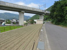 小川を渡って行くと北陸新幹線の高架が街道を横切っている。 | 北陸新幹線の高架下を潜って進んで行くと右手に長野県知事林虎雄揮毫の慰霊碑が建っている。 | 慰霊碑の直ぐ先の座摩神社の参道入口に相撲年寄信濃石品吉之碑がある。 座摩神社では、八十八夜の祭りに奉納相撲が行われていたという。 信濃石品吉之碑の一段上には、明治20年(1887)の内閣書記官巌谷修書の漢文碑が建っている。 |