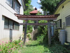 街道を進むと右手の民家の間に屋根の付いた鳥居があり、鳥居の奥の石段を上がった段上に稲荷神社がある。 稲荷神社の創建年代等は不詳であるが、拝殿の裏の段上に稲荷大明神と刻まれた石塔と石祠が建っている。 |