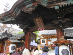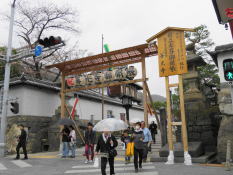 大門南交差点を過ぎると左手に熊野神社の社殿がある。大門町の人々の家内安全・商売繁盛・開運・厄除けとして祀られた守護神である。社前には宝暦9年(1759)の三猿を刻んだ庚申塔が建っている。 | 坂道が急になる大門交差点手前には白壁で統一された土蔵風のお店が並んでいる。 この先の大門交差点には文政8年(1825)の常夜燈が参道両脇に建っている。 |