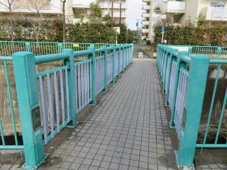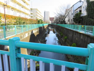 アパートや住宅が迫っており、川は先で左にカーブしている
