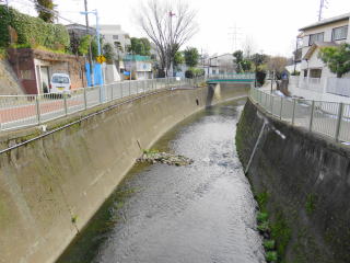 下流に幸福橋が見え、右の川壁にメモリが付いている