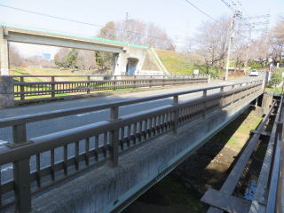 西武多摩川線の高架が通っており、高架下辺りから水の流れが確認できる
