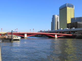 下流に駒形橋が見え、手前に屋形船 「あみ清」 の桟橋がある。
