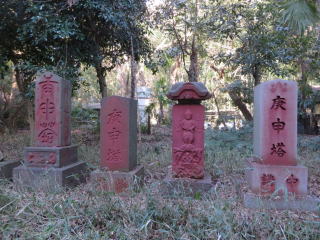 左から宝永3年(1706)の庚申待成就塔、延享3年(1746)の一面六臂の青面金剛の庚申塔、年代不明の文字庚申塔、明治12年(1879)の文字庚申塔