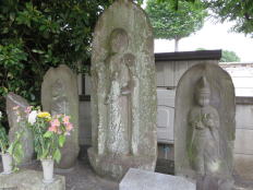 曹洞宗の寺院であり、本尊は大日如来座像で、享保13年(1728)建立の観音堂があり、上高井戸宿の本陣武蔵屋代々の墓がある。 この地蔵は身代わり地蔵尊・出世地蔵尊とも呼ばれた。 墓の脇には、写真のような無数の菩薩像が安置されている。 |