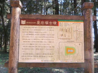 この古墳は、西南に面した前方後円墳で、基壇の上に墳丘を築き、基壇の裾部に周湟(しゅうこう)をめぐらしています。墳丘南側のくびれ部分には、愛宕神社が祀られているため一部が削られていますが、概して保存のよい古墳です。