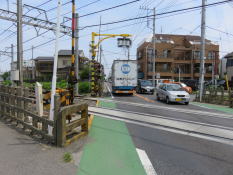 | 道標を左に曲がって間もなく左手に祠があり、不動明王像が乗った道標1基と、5基の庚申塔が安置されている。 | 道標・庚申塔の先で総武本線を跨線橋で渡り、どんどん街道を進んで新京成線の踏切を渡っていく。 新京成線は、新京成津田沼駅から松戸駅までの26.5㎞を結ぶ鉄道路線である。 |