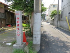 大和田新田交差点を越えて、左手の 「いしい眼科」 の手前路地を入ると、突き当りに稲荷神社がある。 稲荷神社の創建年代等は不詳であるが、狭い境内にはケヤキの大木が聳え、その根元に稲荷神社社殿がある。 |