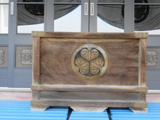 本堂の賽銭箱に刻まれた三つ葉葵の寺紋