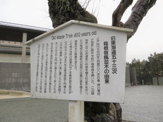 この楓は、当時の宿場の中で本陣参勤交代の折の大名などが泊まる大きな宿泊施設で門構えなどがあり、警護しやすいように建てられた旅館であったはふやの門前に植えられてあったもの。明治中期の道路拡張の際、他の全部の楓は切り払われてしまった。樹齢約400年、これほどの老楓は珍しく、他所にもあまり見ることが出来ぬ、当時の本陣はふやは現在の箱根ホテルである。