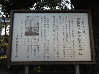 昔、梅屋敷の園内には数多くの碑石がありましたが、所有者が移った時や戦後の混乱期に姿を消してしまいました。この歌碑はそれらの一つを資料をもとに復元したものです。 (大田区)