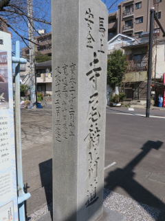 江戸時代、ここは寺尾稲荷社(現馬場稲荷社)へ向かう道との分岐点で、このように寺尾稲荷道と記された大きな道標が建てられていました。寺尾稲荷社は、馬術上達や馬上安全の祈願で知られ、江戸からの参拝者も多かったといいます。また、この道は菊名へ向かう寺尾道や川崎へ向かう小杉道にもつながる、この地域の大切な道でした。なお、当時の道標は、現在、鶴見神社境内にあり、ここにあるのはその複製です。