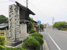 | 瑠璃光橋の渡り詰め右手に、真言宗東寺派の高富山瑠璃光院石薬師寺がある。この標柱から入って行くと裏門があり、街道を進むと右手に表門(山門)がある。 石薬師寺は、神亀3年(726)当地で巨石が地下から出現し、これは薬師如来の出現だとしてお堂を建てたのが始まりという。境内には、地蔵堂、大師堂、天満宮、岩佐又兵衛歌碑、一休禅師歌碑、佐佐木信綱歌碑などがある。 |