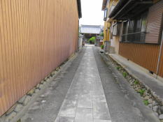 緑色の歩道橋を渡って国道1号線の脇を進むと、左手に延びていく旧道がある。 かつては内部川に架かる石橋の采女橋から続いていた道である。 |