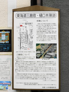 本陣とは江戸時代五街道などの宿場に設けられ、大名、公家、幕府役人などが宿泊した施設で、大名宿とも言いました。 三島宿には、ここに樋口本陣、道を挟んで北側に世古本陣がありました。本陣の建物は書院造で、門構え、玄関、上段の間、控の間などの部屋や湯殿、庭がある広大なものでした。三島市郷土資料館には樋口本陣文書(市指定文化財)と宿泊した大名の関札があります。なお三嶋大社には樋口本陣の茶室 「不二亭」 も移築されています。