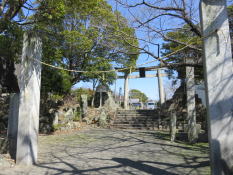 | 先に進むと右手に大社神社がある。 大社神社は、天元・永観年間(978~985)に、時の国司大江定基が三河守としての在任に際して、三河国の安泰を祈念して、出雲国大社より大国主命を勧請たのが始まりという。境内を取り巻く石垣と白い土塀は、近くにあった田沼陣屋の石垣を移築したものと言われる。 境内には、稲荷神社・秋葉神社・金刀比羅神社などの境内社がある。 |
