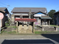 | 巡礼道標の建つ筋を南に入っていくと、右手に浄土宗の巨徳山光明院浄福寺がある。浄福寺は、慶長2年(1250)、記主禅師然阿良忠上人が開山といわれている。境内には、地蔵堂のほか、地蔵教一万部供養成就塔、馬頭観音などがある。 | 街道に戻って350m程進むと、右手の香取市消防団小見川支団第4分団の建屋の隣に諏訪大神がある。諏訪大神は、小見川城主粟飯原式部太夫胤秀により創建され、天正18年(1590)、小見川城廃城の際に当地に移されたと伝えられている。境内には、出羽三山碑、青面金剛の庚申塔、榛名山大権現石祠などの石造物がある。 | 諏訪大神から程なく信号のあるT字路右手に昭和3年(1928)の御大典記念碑が建っている。記念碑は、道標を兼ねており、「北 大倉村津之宮方面、西 分郷神里村方面、東 重川町笹川町銚子町方面」 と刻まれている。 | 御大典記念碑から50m程先、左手に不動堂がある。不動堂の由緒等は不明であるが、境内には手水舎、比較的新しい狛犬が建っている。 |